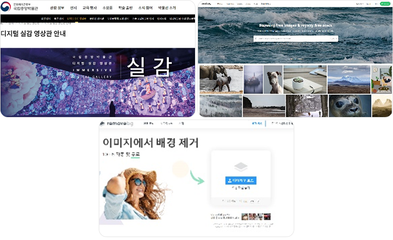 그리고 12주차에는 한국화 감상법에 대한 오프라인 교육을 진행 후 실제 아이들이 감상 체크리스트 등을 통해 감상과 지도법을 익히게 한 후 팀별로 한국화 관련된 전시 기획을 영상으로 진행하도록 하였다. VR 온라인 전시관, 메타버스, PPT 영상녹화를 활용한 영상 제작이 진행되었고 이 과정에서 학생들이 픽사 베이 등 무료 이미지 다운 플랫폼과 무료 온라인 전시관 <그림1> 등을 서치하게 하여 제작에 이용하도록 하였다.(진행과정과 학생들의 결과물 예시는 <그림2>와 같다.)
