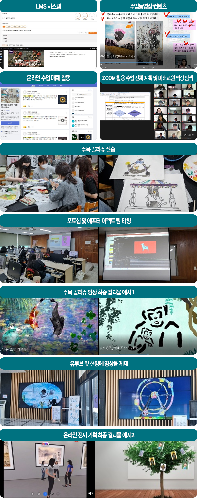1-6주차에 걸쳐 사전 온라인 베이스 수업을 진행하고 7-9주차에 걸쳐 수묵 꼴라쥬 제작물을 포토샵과 에프터이펙트 등의 디지털 매체를 활용해 영상의 제작을 하였다. 그리고 12-14주차에 걸쳐 한국화 감상법을 소개하고 실제 감상 체크리스트 등을 작성해 보며 직접 한국화가 포함된 전시 기획을 VR이나 메타버스를 포함한 다양한 디지털 매체를 활용하여 영상으로 제작하도록 하고 15주차에 동료평가와 자기평가를 통해 수업을 마무리 하였다.
