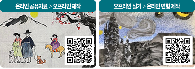 | 학습환경으로서 온·오프라인 융합 역량 | 거블렌디드 학습 환경을 구성하기 위하여 적절한 온라인 학습 도구를 활용할 수 있다. *오프라인 학습 활용 역량 블렌디드 학습 환경을 구성하기 위하여 적절한 교실 수업 전략을 활용할 수 있다. ≪직접 제작한 오프라인 상에서의 작품들을 디지털 매체를 활용하여 융합하거나 온라인 공유 자료의 선 제공을 활용한 오프라인 작품제작 |
